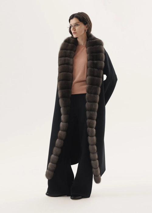 Ein Mantel aus 100% doppeltem Kaschmir mit Pelzbesatz über die gesamte Länge des Produkts. Die aktualisierte Version des Mantels erhielt einen verbesserten Schnitt sowie eine noch luxuriösere Variante des Schalkragens, die sanft in die Seitenkante übergeht.