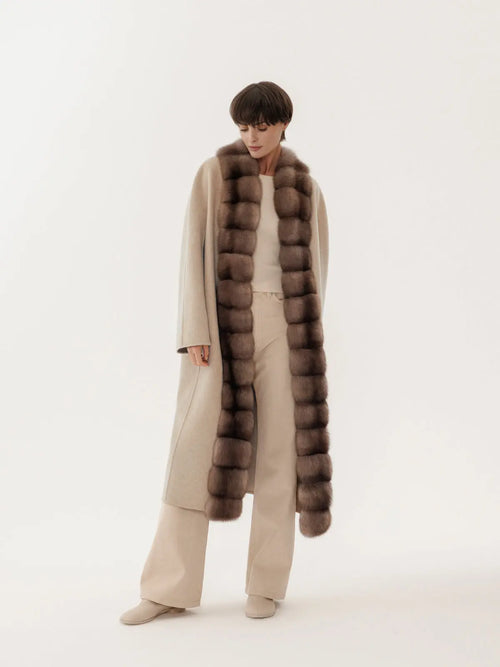 Ein Kaschmirmantel aus 100% italienischem Kaschmir im Beigeton, ergänzt durch einen Zobelfellbesatz entlang der gesamten Seite – er ist in der neuen Saison ein universelles Kleidungsstück in Ihrer Garderobe.