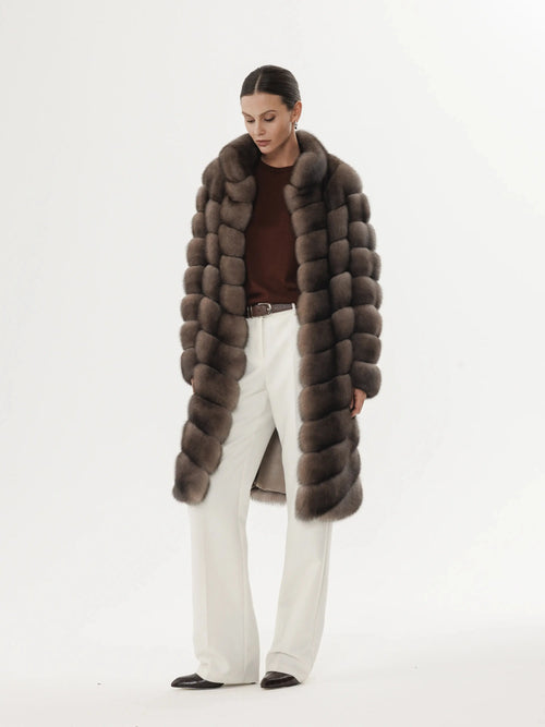 Klassischer Zobelpelzmantel in der atemberaubenden Farbe Desert Ice in Aschbeige. Dieser makellos geschnittene Pelzmantel verfügt über einen voluminösen einteiligen Schalkragen aus strapazierfähigem Zobelfell und gemütliche Seitentaschen.